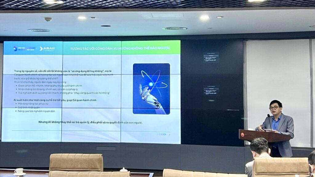 Trong khuôn khổ chương trình, ông Đỗ Như Lâm, Giám đốc Đào tạo Viện Công nghệ Blockchain và Trí tuệ Nhân tạo ABAII, đã chia sẻ chuyên đề “AI trong tương tác với người dân”, tập trung phân tích các mô hình triển khai AI trong khu vực công tại nhiều quốc gia và những nguyên tắc có thể vận dụng vào thực tiễn Việt Nam.