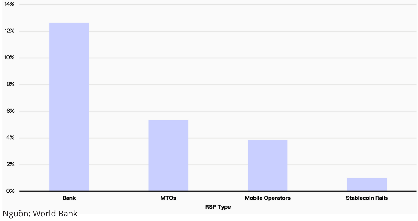 Theo báo cáo, chi phí giao dịch qua ngân hàng là cao nhất, kế đến là các tổ chức chuyển tiền (MTO) và nhà mạng di động. Các ngân hàng hiện thu trung bình 12,66% phí cho một khoản kiều hối 200 USD, trong khi một số nền tảng stablecoin gần như miễn phí nạp – rút. Tổng mức tiết kiệm chi phí có thể đạt 92% so với ngân hàng.